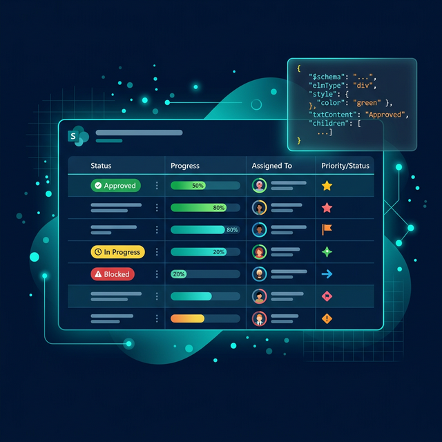JSON formatting lets you transform any column, row, or entire view into a visual dashboard — without writing a single line of C#, deploying an SPFx web part, or touching the app catalog. You write JSON, paste it into SharePoint, and it works instantly for everyone who views that list.